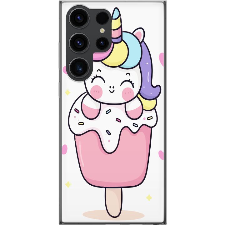 Ett genomskinligt mobilskal för Galaxy S24 Ultra med ett trendigt Glad enhörning tryck på baksidan. Skalet har en perfekt passform som skyddar din telefon mot repor, damm och smuts samtidigt som designen gör mobilen mer personlig.