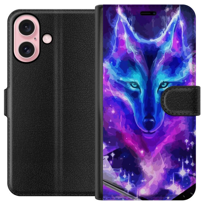 Plånboksfodral för iPhone 16 med Neon Varg -design. Fodralet kombinerar stil och funktion – ett slitstarkt mobilskal som skyddar mot repor och stötar samt praktiska kortfack på insidan.