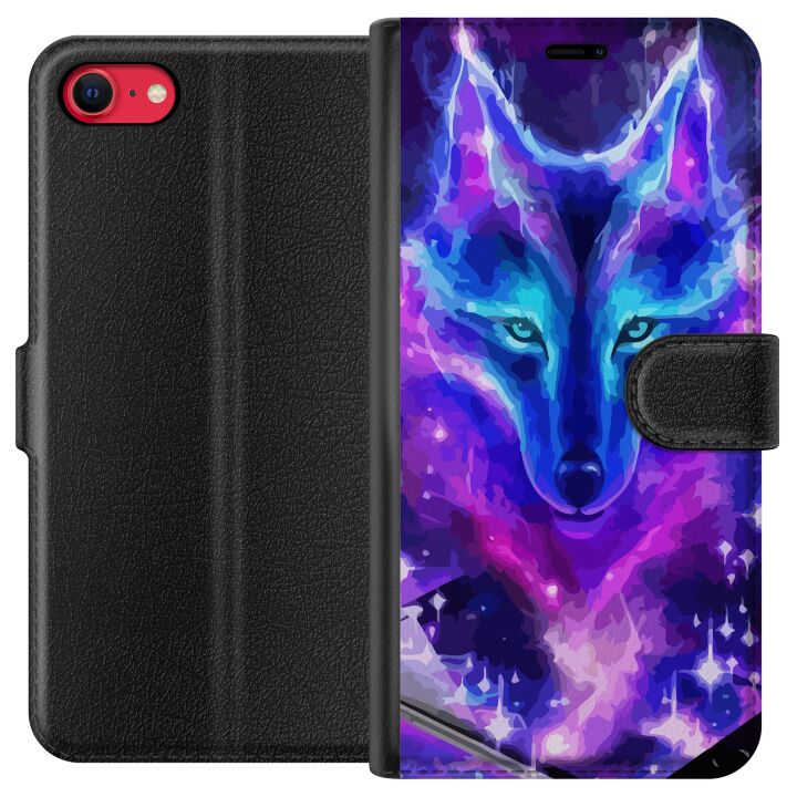 Plånboksfodral för iPhone SE (2020) med Neon Varg -design. Fodralet kombinerar stil och funktion – ett slitstarkt mobilskal som skyddar mot repor och stötar samt praktiska kortfack på insidan.