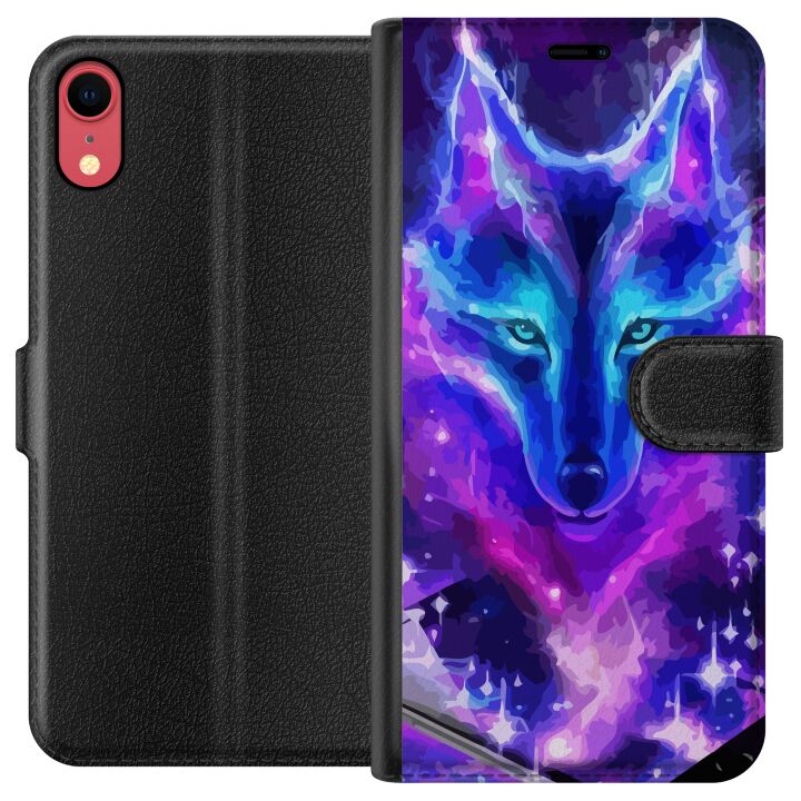 Plånboksfodral för iPhone XR med Neon Varg -design. Fodralet kombinerar stil och funktion – ett slitstarkt mobilskal som skyddar mot repor och stötar samt praktiska kortfack på insidan.