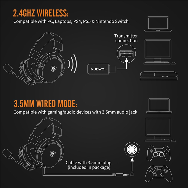 NUBWO Over-Ear Trådlösa Gaming Hörlurar 2.4G Brusreducerande Mikrofon Stereo för PC, Bärbara Datorer, PS4, PS5, Nintendo Switch G07 - Svart