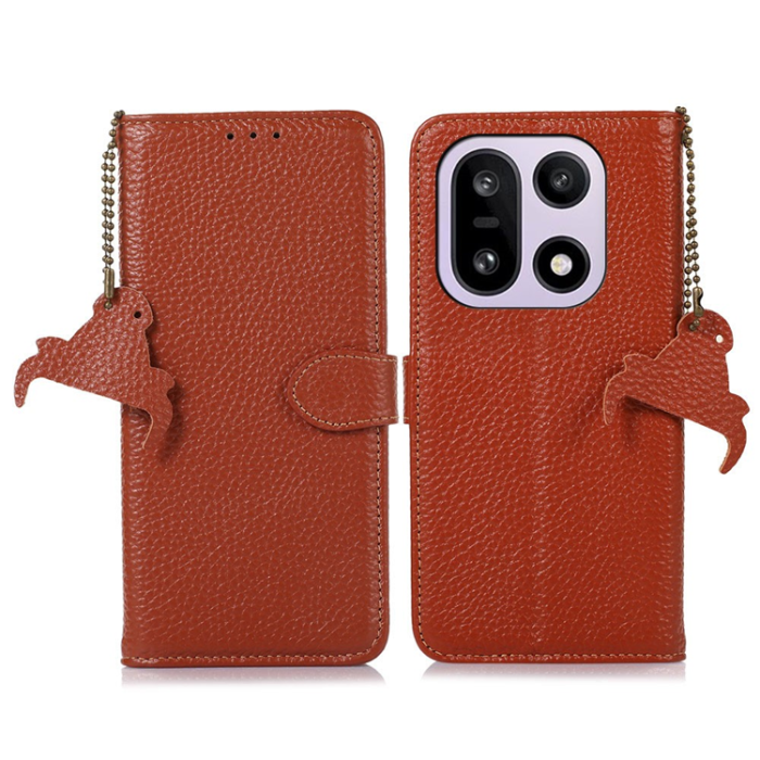 OnePlus 15 5G Plånboksfodral Äkta Läder RFID Blocking Litchi Texture - Brun