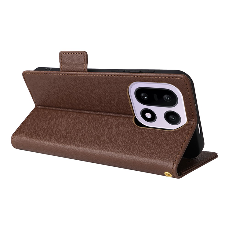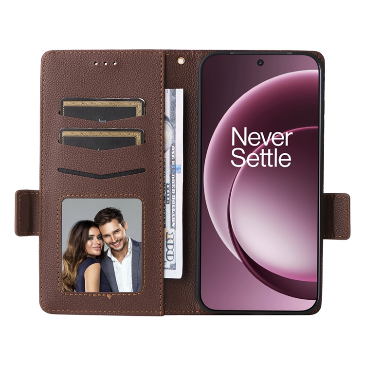 OnePlus 15 5G Plånboksfodral Litchi Texture Läder med handledsrem - Brun