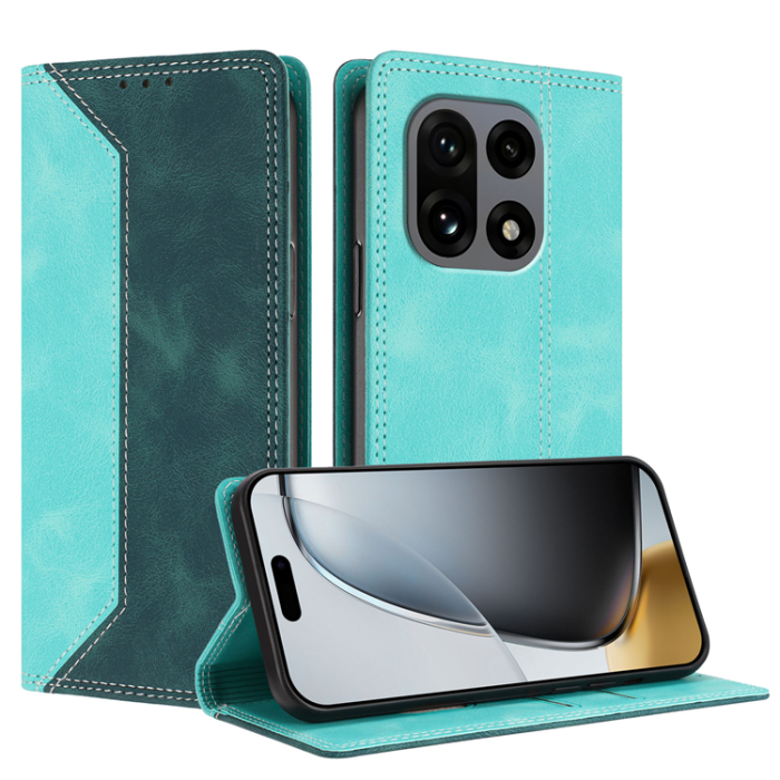 OnePlus 15 Konstläder Plånboksfodral Färg Splicing RFID-Skydd (Grön/Mörkgrön)