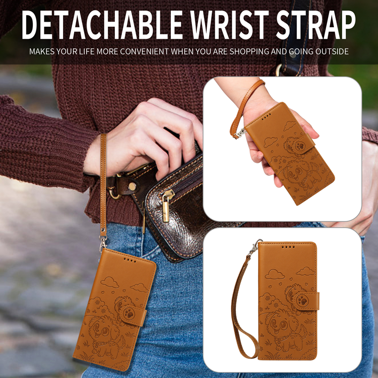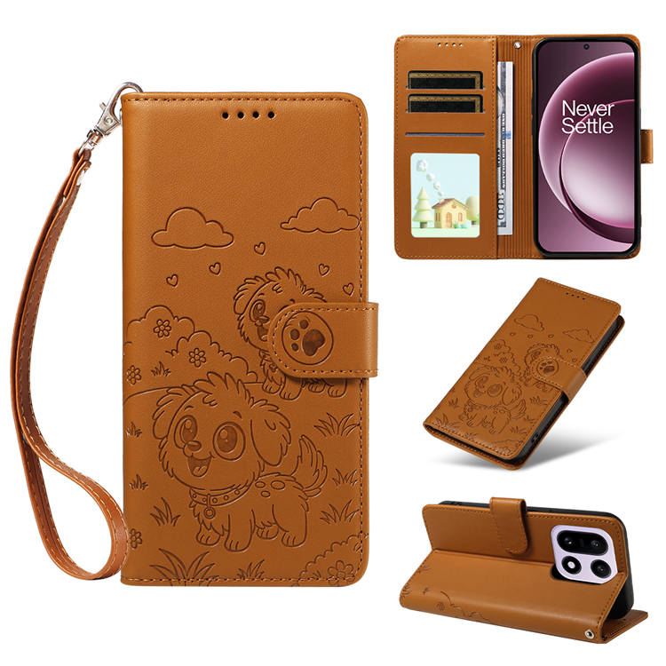 OnePlus 15 5G Plånboksfodral RFID Blocking Imprinted Dog Pattern med handledsrem - Brun