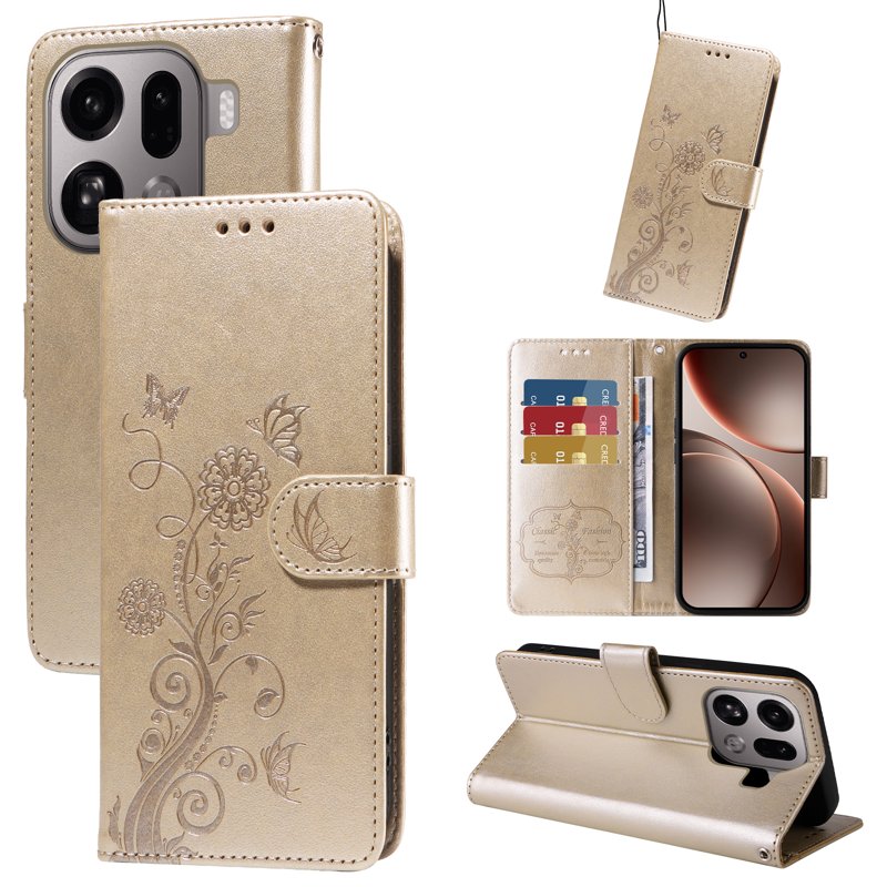 Oppo Find X9 Pro 5G Fodral Äkta Läder Blomtryck - Guld