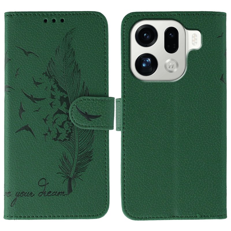 Skydda din Oppo Find X9 Pro 5G med det eleganta Feather Imprint PU Leather Wallet Phone Cover i grön färg. Denna plånboksfodral kombinerar stil och funktionalitet. Med en lyxig känsla och praktiska funktioner är detta fodral det perfekta valet för den moderna användaren.