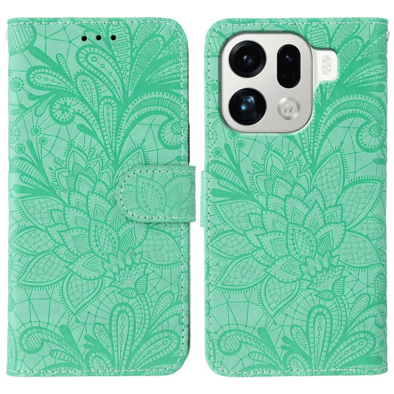 Skydda din Oppo Find X9 Pro 5G med detta eleganta Lace Flowers PU Leather Flip Wallet Phone Cover i grön. Denna mobilskal kombinerar stil och funktionalitet. Med ett vackert blommönster ger det ett sofistikerat utseende samtidigt som det erbjuder utmärkt skydd för din telefon.