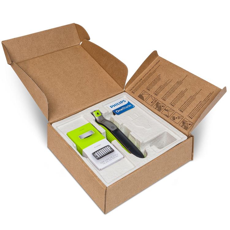 Philips OneBlade har en revolutionerande teknik utformad för skäggstyling och grooming. Den kan trimma, styla och raka oavsett skägglängd. Det dubbla skyddssystemet – en glidande beläggning med rundade kanter runt skärelementen – gör rakningen mer skonsam mot huden. Samtidigt har raktekniken en snabb skärenhet (200 x per sekund) så den är effektiv – även på längre skäggstrån.
