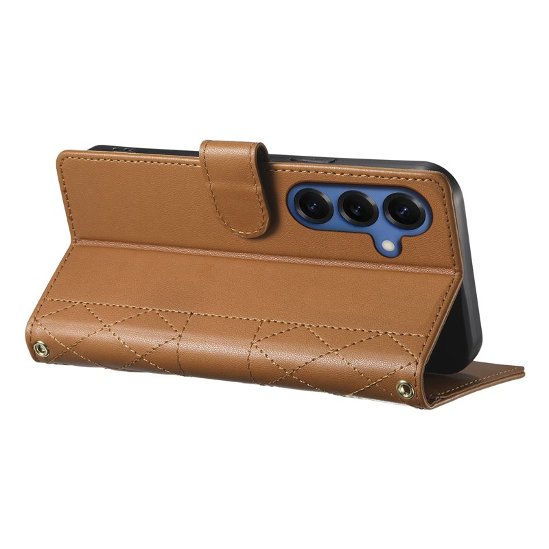 Skydda din Samsung Galaxy S26 med det eleganta Wallet Case Rhombus Stitching Stand. Detta läderfodral kombinerar stil och funktionalitet. Med flera kortfack och en praktisk ståfunktion är det perfekt för den moderna användaren. Njut av säkerhet och bekvämlighet i ett och samma fodral.