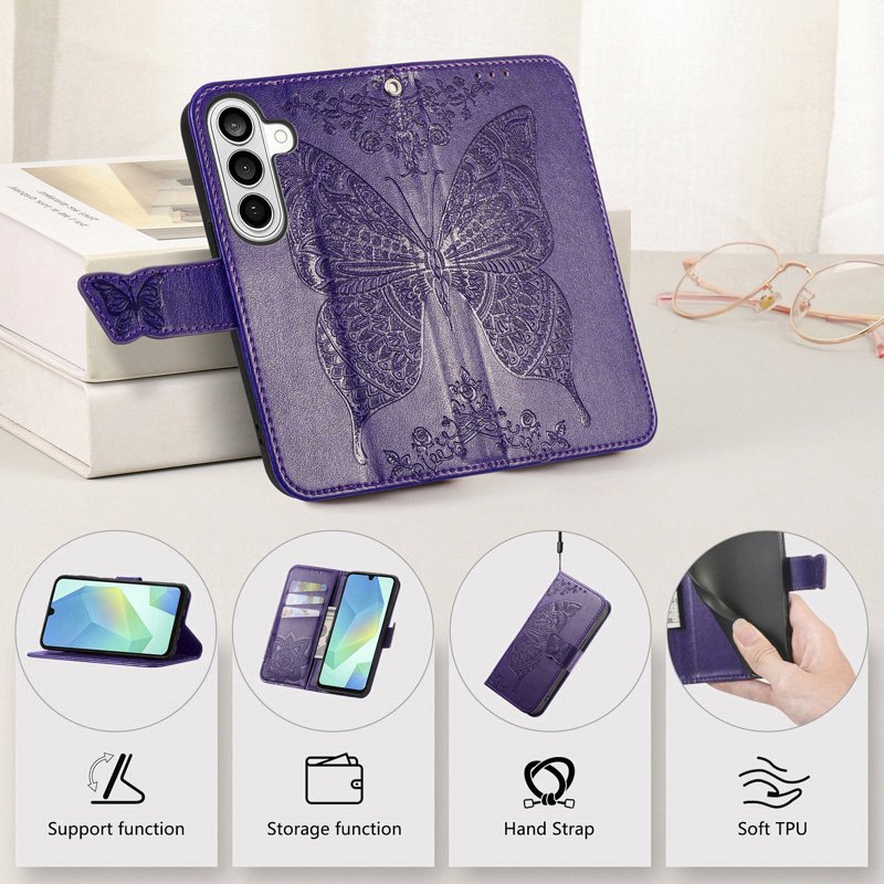 Skydda din Samsung Galaxy S26 med detta eleganta och funktionella fodral i mörklila PU-läder med fjärilsdesign. Fodralet erbjuder både stil och praktiska funktioner. Med plats för kort och kontanter, en stabil ställning och ett handtag, är detta fodral perfekt för den moderna användaren som vill ha både säkerhet och bekvämlighet.