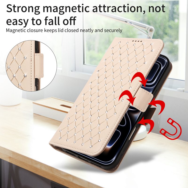 Skydda din Samsung Galaxy S26 Plus med denna eleganta läderfodral. Med en glittrande rhombusdesign och praktiska funktioner erbjuder detta fodral både stil och säkerhet. Det är den perfekta lösningen för den moderna användaren som värdesätter både estetik och funktionalitet.