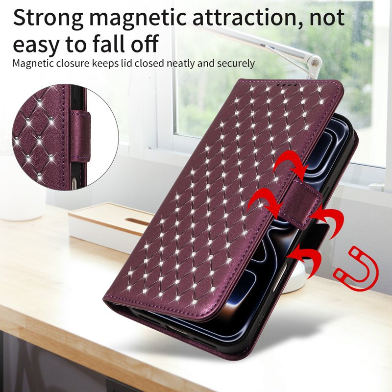 Skydda din Samsung Galaxy S26 Plus med denna eleganta läderfodral. Med en gnistrande rhombusdesign och praktiska funktioner är detta fodral både stiligt och funktionellt. Det erbjuder utmärkt skydd och bekvämlighet, vilket gör det till det perfekta valet för den moderna användaren.