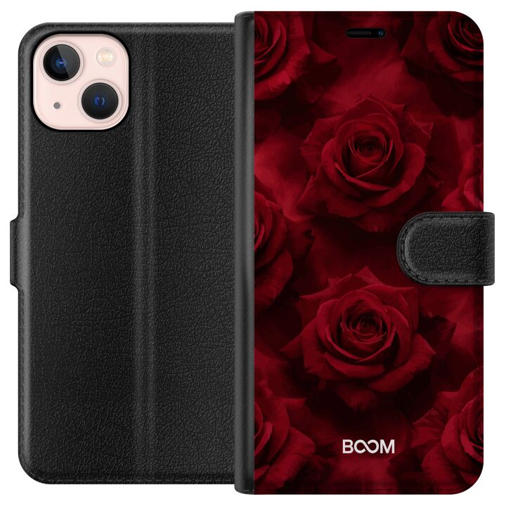 Plånboksfodral för iPhone 13 med Crimson Rose -design. Fodralet kombinerar stil och funktion – ett slitstarkt mobilskal som skyddar mot repor och stötar samt praktiska kortfack på insidan.