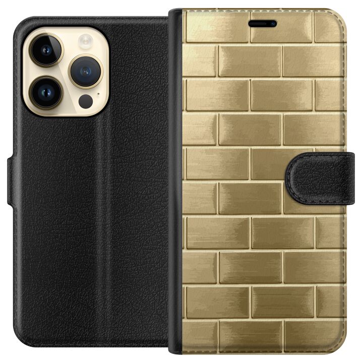 Plånboksfodral för iPhone 15 Pro med Gyllene Murstenar -design. Fodralet kombinerar stil och funktion – ett slitstarkt mobilskal som skyddar mot repor och stötar samt praktiska kortfack på insidan.