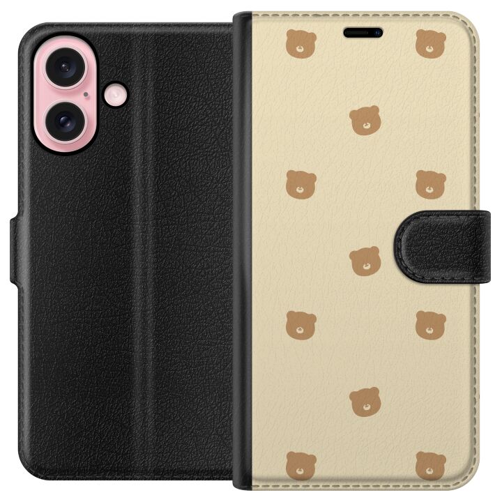 Plånboksfodral för iPhone 16 med Björnmönster -design. Fodralet kombinerar stil och funktion – ett slitstarkt mobilskal som skyddar mot repor och stötar samt praktiska kortfack på insidan.