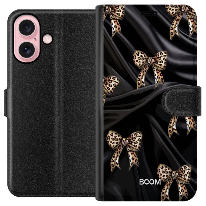 Plånboksfodral för iPhone 16 med Leopard Bow -design. Fodralet kombinerar stil och funktion – ett slitstarkt mobilskal som skyddar mot repor och stötar samt praktiska kortfack på insidan.
