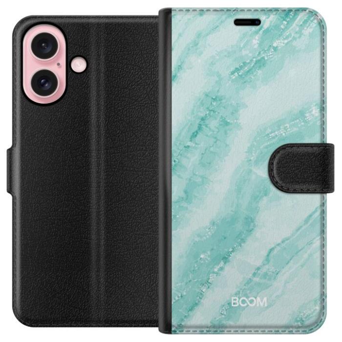 Plånboksfodral för iPhone 16 med Mint Marble -design. Fodralet kombinerar stil och funktion – ett slitstarkt mobilskal som skyddar mot repor och stötar samt praktiska kortfack på insidan.