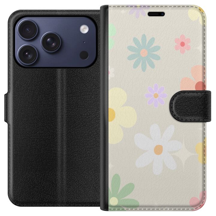 Plånboksfodral för iPhone 17 Pro med fejdande blommor -design. Fodralet kombinerar stil och funktion – ett slitstarkt mobilskal som skyddar mot repor och stötar samt praktiska kortfack på insidan.