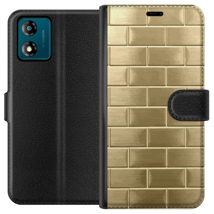 Plånboksfodral för Moto E13 med Gyllene Murstenar -design. Fodralet kombinerar stil och funktion – ett slitstarkt mobilskal som skyddar mot repor och stötar samt praktiska kortfack på insidan.
