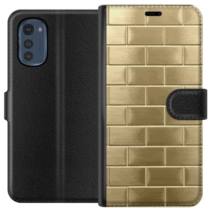 Plånboksfodral för Moto E32s med Gyllene Murstenar -design. Fodralet kombinerar stil och funktion – ett slitstarkt mobilskal som skyddar mot repor och stötar samt praktiska kortfack på insidan.