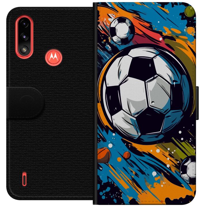Plånboksfodral för Moto E7 Power med Fotbollar -design. Fodralet kombinerar stil och funktion – ett slitstarkt mobilskal som skyddar mot repor och stötar samt praktiska kortfack på insidan.