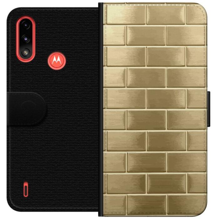 Plånboksfodral för Moto E7 Power med Gyllene Murstenar -design. Fodralet kombinerar stil och funktion – ett slitstarkt mobilskal som skyddar mot repor och stötar samt praktiska kortfack på insidan.