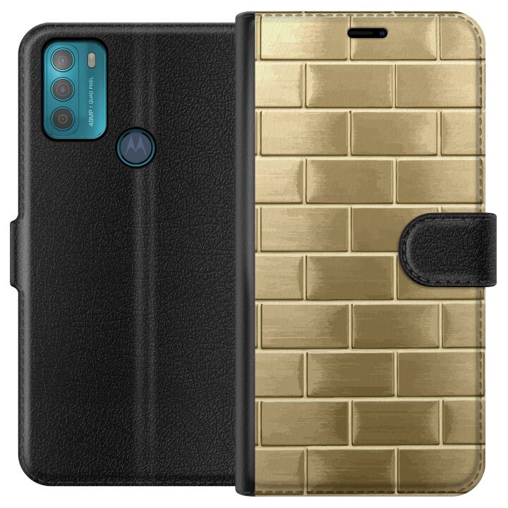 Plånboksfodral för Moto G50 med Gyllene Murstenar -design. Fodralet kombinerar stil och funktion – ett slitstarkt mobilskal som skyddar mot repor och stötar samt praktiska kortfack på insidan.