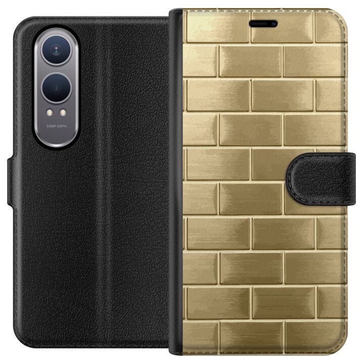 Plånboksfodral för Nord CE4 Lite med Gyllene Murstenar -design. Fodralet kombinerar stil och funktion – ett slitstarkt mobilskal som skyddar mot repor och stötar samt praktiska kortfack på insidan.