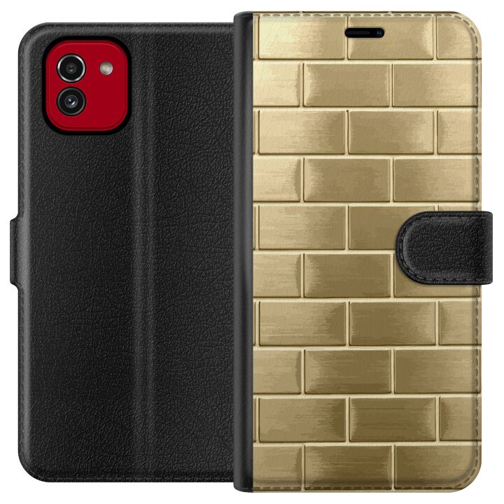 Plånboksfodral för Galaxy A03 med Gyllene Murstenar -design. Fodralet kombinerar stil och funktion – ett slitstarkt mobilskal som skyddar mot repor och stötar samt praktiska kortfack på insidan.