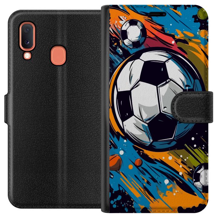 Plånboksfodral för Galaxy A20e med Fotbollar -design. Fodralet kombinerar stil och funktion – ett slitstarkt mobilskal som skyddar mot repor och stötar samt praktiska kortfack på insidan.