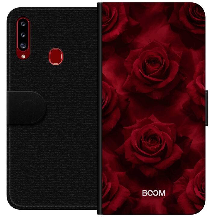 Plånboksfodral för Galaxy A20s med Crimson Rose -design. Fodralet kombinerar stil och funktion – ett slitstarkt mobilskal som skyddar mot repor och stötar samt praktiska kortfack på insidan.