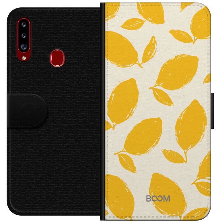 Plånboksfodral för Galaxy A20s med Lemon Breeze -design. Fodralet kombinerar stil och funktion – ett slitstarkt mobilskal som skyddar mot repor och stötar samt praktiska kortfack på insidan.