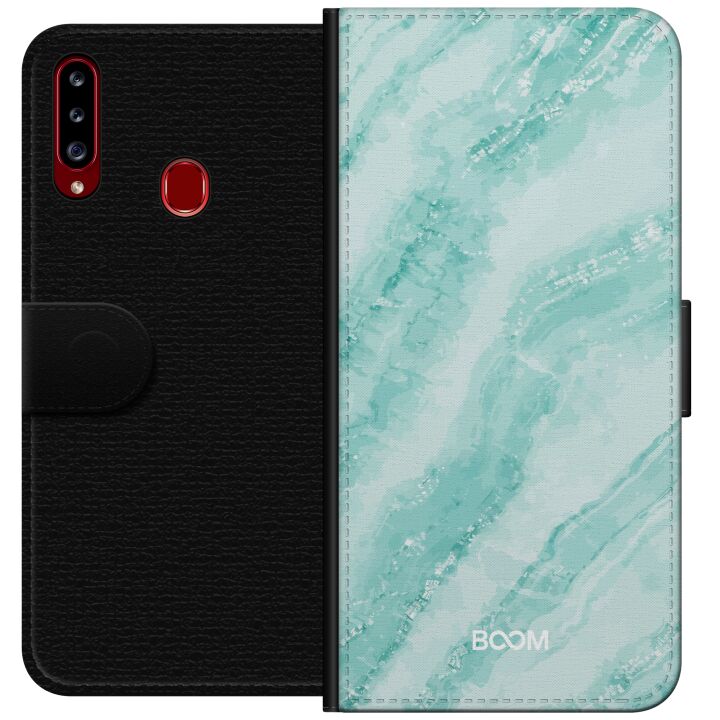 Plånboksfodral för Galaxy A20s med Mint Marble -design. Fodralet kombinerar stil och funktion – ett slitstarkt mobilskal som skyddar mot repor och stötar samt praktiska kortfack på insidan.