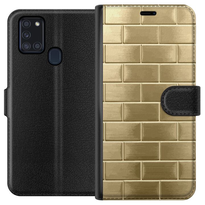 Plånboksfodral för Galaxy A21s med Gyllene Murstenar -design. Fodralet kombinerar stil och funktion – ett slitstarkt mobilskal som skyddar mot repor och stötar samt praktiska kortfack på insidan.
