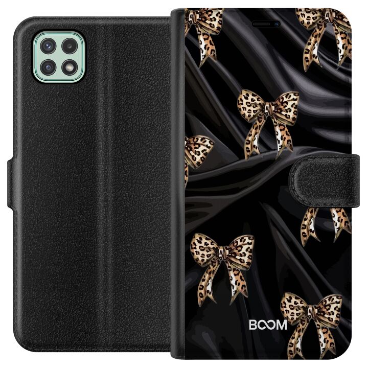Plånboksfodral för Galaxy A22 5G med Leopard Bow -design. Fodralet kombinerar stil och funktion – ett slitstarkt mobilskal som skyddar mot repor och stötar samt praktiska kortfack på insidan.
