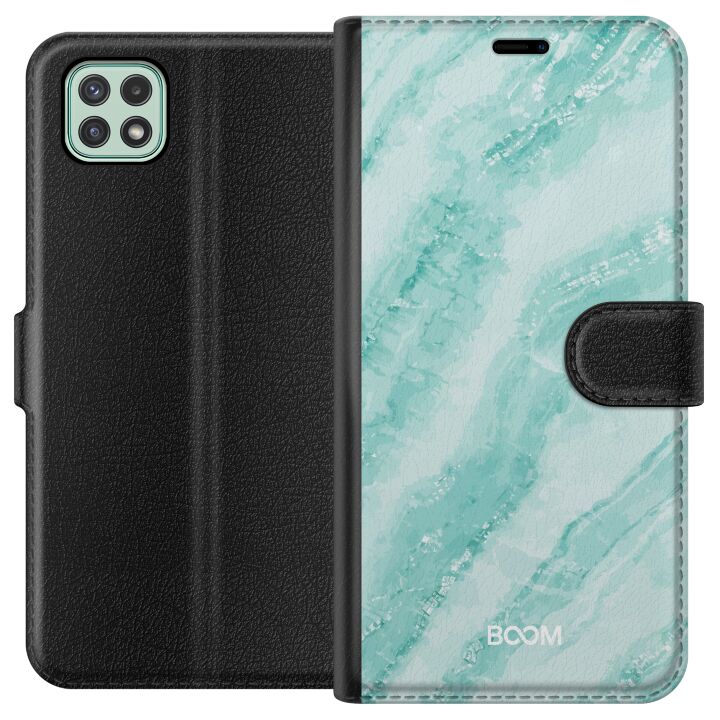 Plånboksfodral för Galaxy A22 5G med Mint Marble -design. Fodralet kombinerar stil och funktion – ett slitstarkt mobilskal som skyddar mot repor och stötar samt praktiska kortfack på insidan.