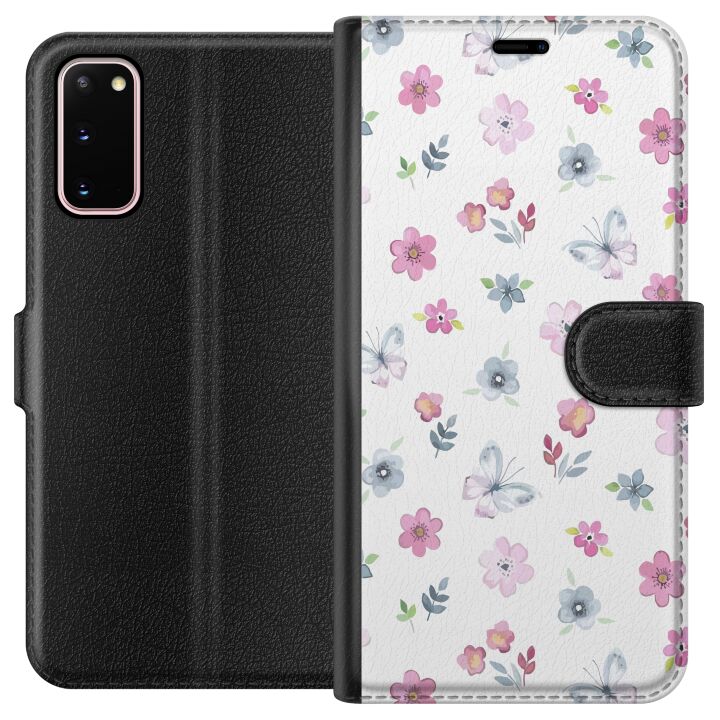 Plånboksfodral för Galaxy S20 med Blommor och fjärillar -design. Fodralet kombinerar stil och funktion – ett slitstarkt mobilskal som skyddar mot repor och stötar samt praktiska kortfack på insidan.