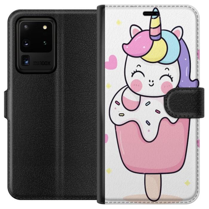 Plånboksfodral för Galaxy S20 Ultra med Glad enhörning -design. Fodralet kombinerar stil och funktion – ett slitstarkt mobilskal som skyddar mot repor och stötar samt praktiska kortfack på insidan.
