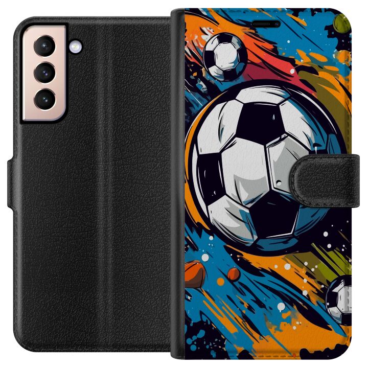 Plånboksfodral för Galaxy S21 med Fotbollar -design. Fodralet kombinerar stil och funktion – ett slitstarkt mobilskal som skyddar mot repor och stötar samt praktiska kortfack på insidan.