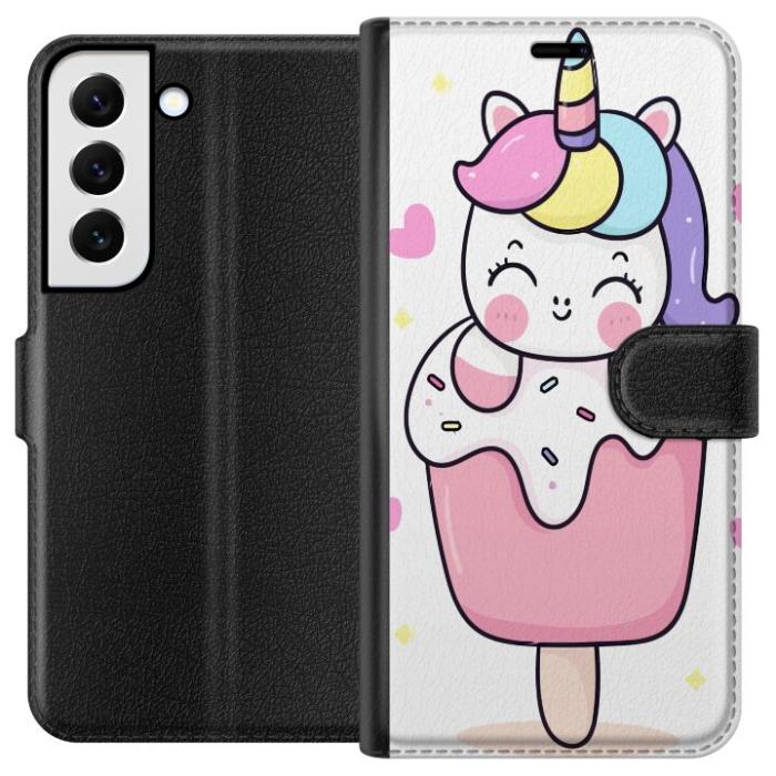 Plånboksfodral för Galaxy S22+ 5G med Glad enhörning -design. Fodralet kombinerar stil och funktion – ett slitstarkt mobilskal som skyddar mot repor och stötar samt praktiska kortfack på insidan.