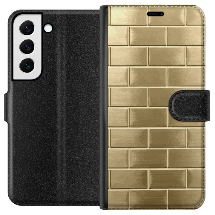 Plånboksfodral för Galaxy S22+ 5G med Gyllene Murstenar -design. Fodralet kombinerar stil och funktion – ett slitstarkt mobilskal som skyddar mot repor och stötar samt praktiska kortfack på insidan.