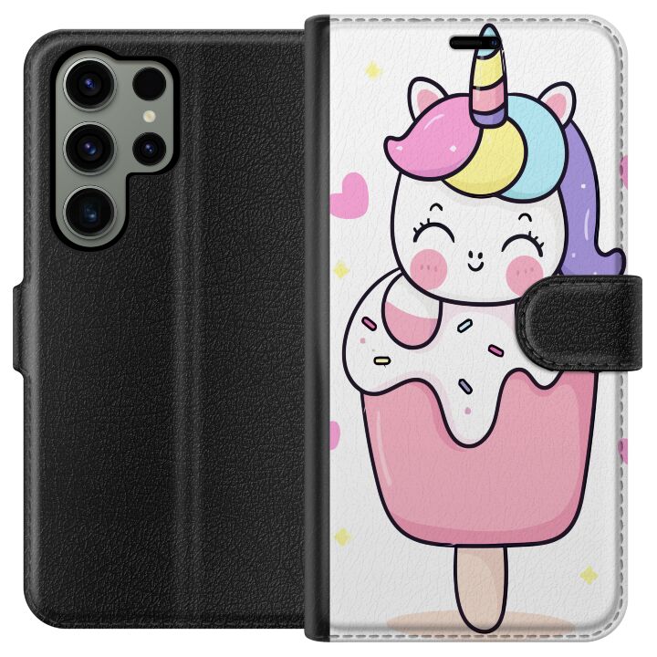 Plånboksfodral för Galaxy S23 Ultra med Glad enhörning -design. Fodralet kombinerar stil och funktion – ett slitstarkt mobilskal som skyddar mot repor och stötar samt praktiska kortfack på insidan.