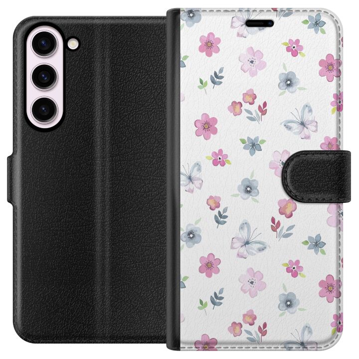 Plånboksfodral för Galaxy S23+ med Blommor och fjärillar -design. Fodralet kombinerar stil och funktion – ett slitstarkt mobilskal som skyddar mot repor och stötar samt praktiska kortfack på insidan.