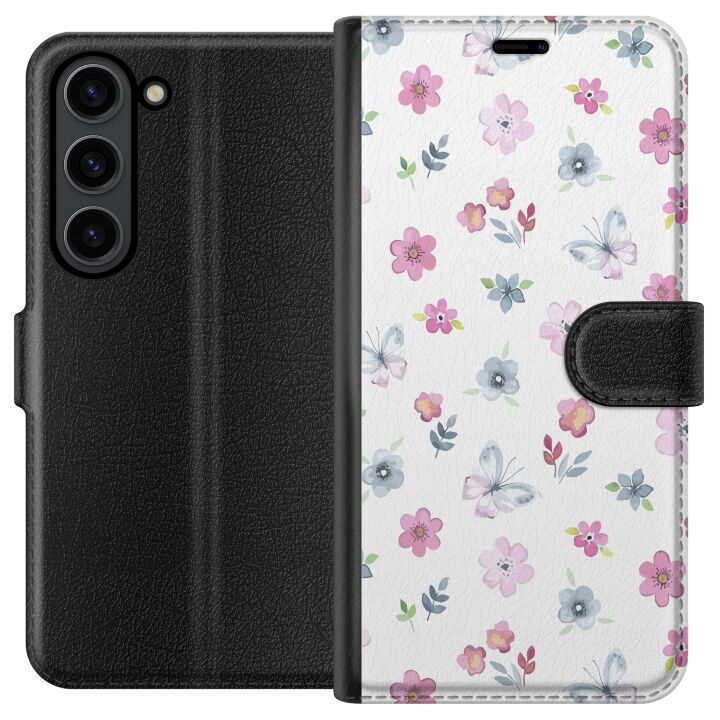 Plånboksfodral för Galaxy S24 med Blommor och fjärillar -design. Fodralet kombinerar stil och funktion – ett slitstarkt mobilskal som skyddar mot repor och stötar samt praktiska kortfack på insidan.