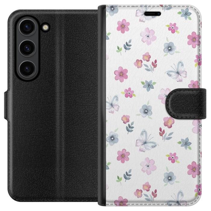 Plånboksfodral för Galaxy S24+ med Blommor och fjärillar -design. Fodralet kombinerar stil och funktion – ett slitstarkt mobilskal som skyddar mot repor och stötar samt praktiska kortfack på insidan.