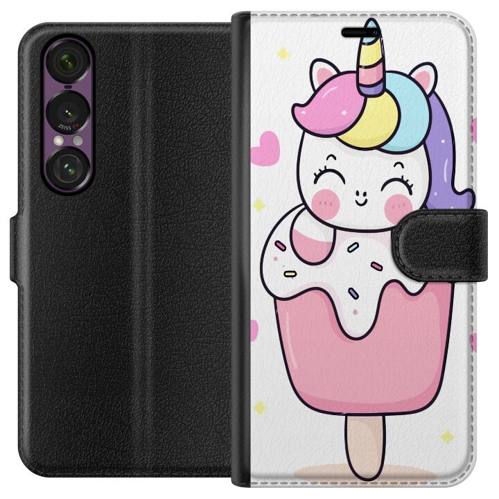 Plånboksfodral för Xperia 1 VII med Glad enhörning -design. Fodralet kombinerar stil och funktion – ett slitstarkt mobilskal som skyddar mot repor och stötar samt praktiska kortfack på insidan.