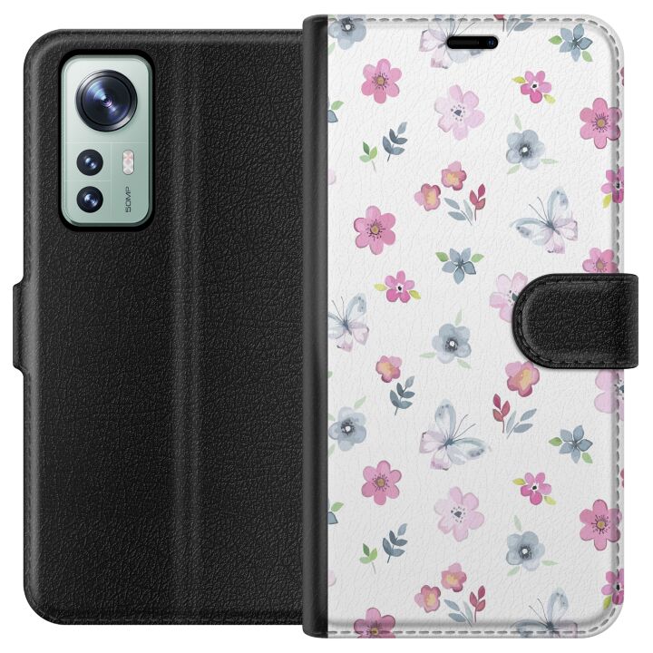 Plånboksfodral för 12 med Blommor och fjärillar -design. Fodralet kombinerar stil och funktion – ett slitstarkt mobilskal som skyddar mot repor och stötar samt praktiska kortfack på insidan.