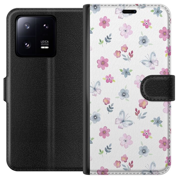 Plånboksfodral för 13 Pro med Blommor och fjärillar -design. Fodralet kombinerar stil och funktion – ett slitstarkt mobilskal som skyddar mot repor och stötar samt praktiska kortfack på insidan.