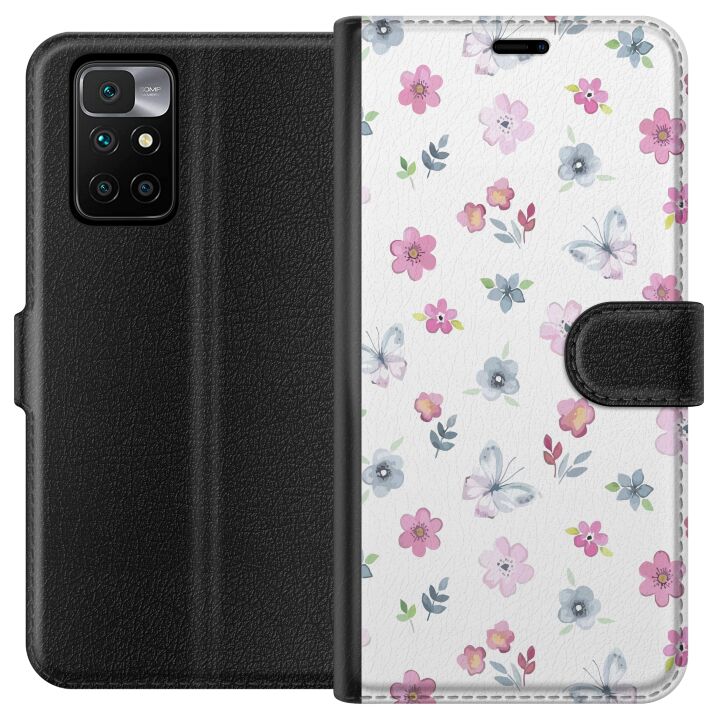 Plånboksfodral för Redmi 10 med Blommor och fjärillar -design. Fodralet kombinerar stil och funktion – ett slitstarkt mobilskal som skyddar mot repor och stötar samt praktiska kortfack på insidan.